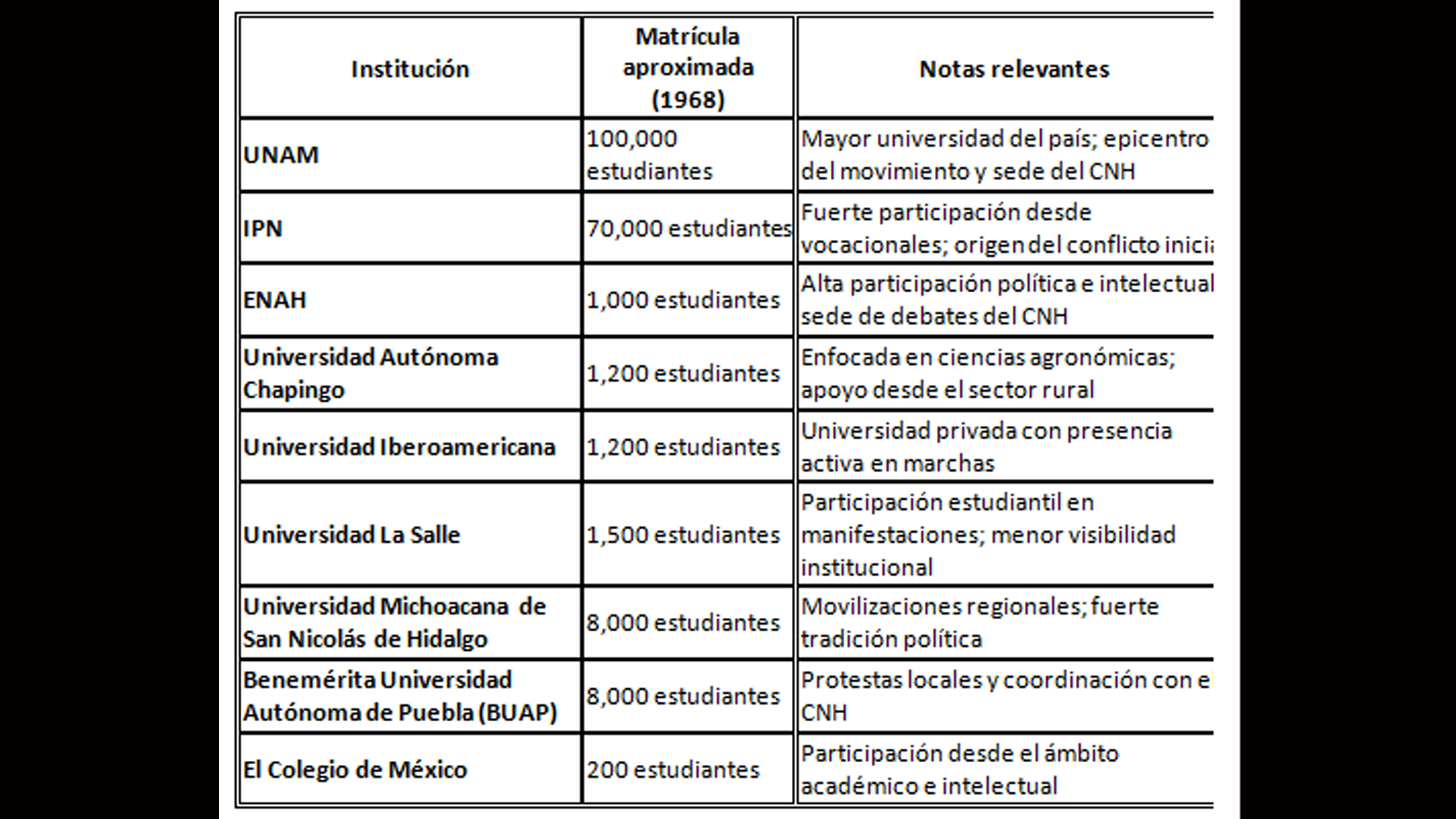 Matrícula estimada de las principales instituciones que participaron en las protestas estudiantiles de 1968