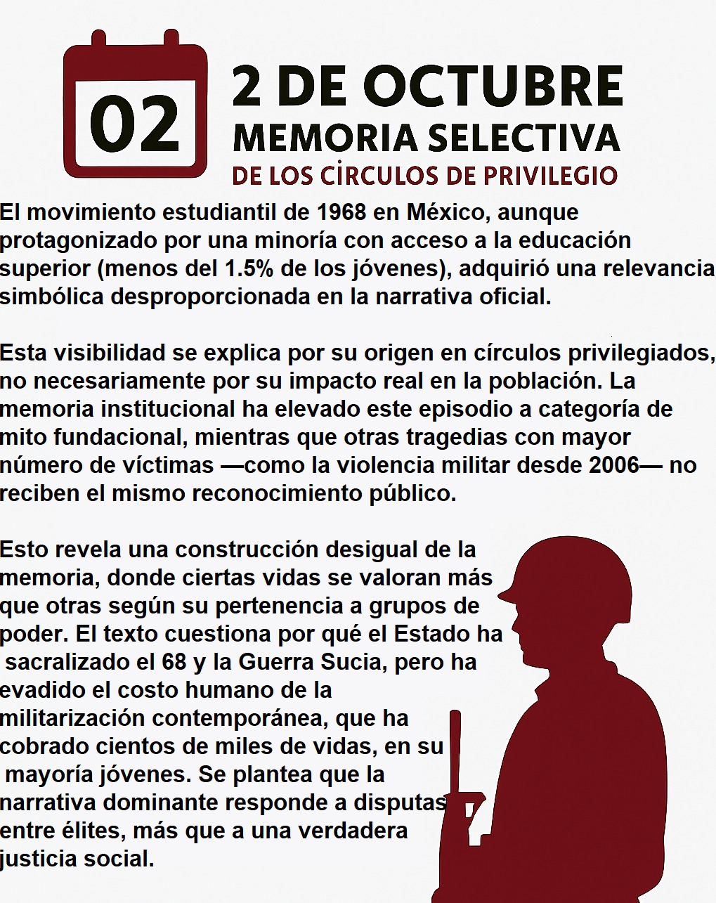 Es a través de este conflicto entre los que conforman los círculos de privilegio que se puede explicar que un movimiento que estuvo conformado con una representación demográfica ínfima tenga una repercusión simbólica y política tan dominante en el discurso público actual, que el calendario cívico se haya llenado de celebraciones que aluden organicamente a unos cientos de miles (en el mejor de los casos), los santorales oficiales y memoriales tengan como ofrendas la vida de alrededor de 3 mil acaecidos, según registros oficiales y de organismos civiles, que sin ser deseables y evidencia dolorosas para miles de familias, están lejos de las afectaciones de otros episodios históricos como la Revolución mexicana donde se establece un rango de perdida de millones de vidas (entre 1.4 y 3.5 millones) por no hablar del sisma económico y social que devino con este movimiento armado.