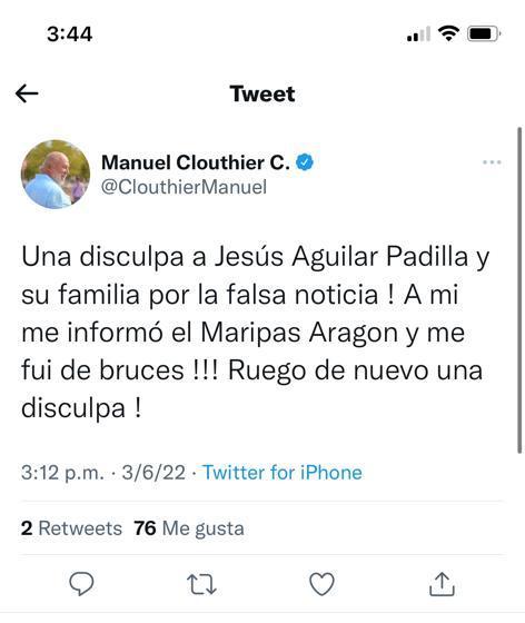Tanto Clouthier como un servidor, tenemos una relación de amistad personal con Jesús Aguilar Padilla y con su familia, también no olvidemos que también su esposa, la Sra. Rosalía Camacho, cuenta con muchos afectos aquí en la capital, desafortunadamente ella pasa por un quebranto de salud que desde unos días atrás se ha complicado. Ambos fallamos en nuestro objetivo de contribuir (sin que nos lo pidieran) modestamente, para que el trance le resulte menos difícil a la familia. Manuel ya les ofreció explicaciones y disculpas, lo hizo en caliente y de manera pública porque su circunstancia es distinta a la mía. Por lo mismo yo haré lo conducente pero en momentos distintos para cada una. En este punto concluye la parte que atañe al tema en sí. Es decir la parte privada y que no es asunto del resto del planeta porque no es un tema periodístico. Si se enteraron, fue por un acto involuntario y accidental que resulto muy penoso para todos los participantes, de una manera más particular para los dos que lo provocamos porque nos dio vergüenza. Mucha vergüenza. Y no me da vergüenza decirlo porque no fue por una falsedad sino por un error. Quienes piensen que es lo mismo ya no se molesten en refrendarlo. Y si estaban pensando que aquí se va a armar la gorda lamento informarles que todo lo contrario.