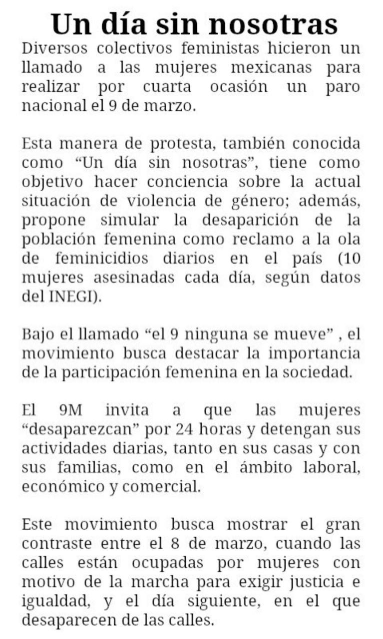 El colmo son las novedades que pretenden imponernos, empezando con lo de “no se festeja, se conmemora”, para aterrizar en la ridiculez del “Un día sin nosotras”, o lo que es lo mismo: sea conmemoración o festejo, hay que ensartarle al calendario político-laboral otro día de asueto pues la propuesta es que las mujeres detengan sus actividades diarias, en sus casas y con sus familias, además del ámbito laboral, económico y comercial. Si esto no es suficiente para que nos saquen por lo menos una nariz de ventaja, en la reñida carrera para decidir quiénes son capaces de inventar las mayores pendejadas, entonces yo no sé qué diablos más hace falta. Que se agarren toda la semana… es más, todo el mes de una vez.