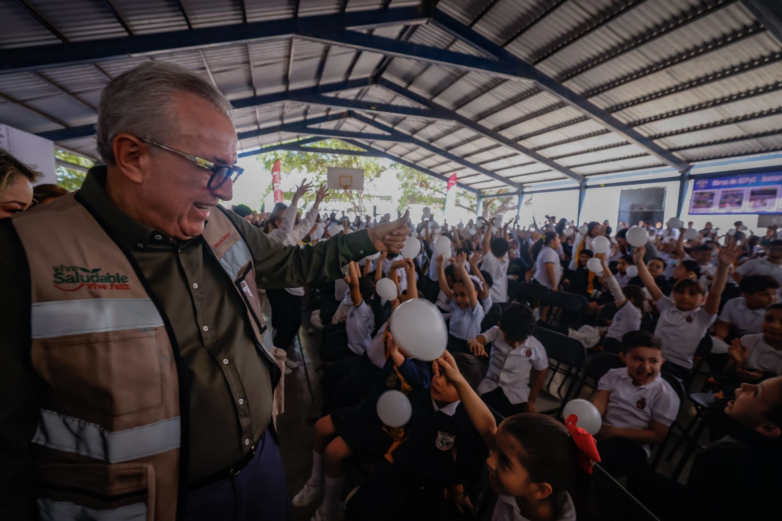 Culiacán, Sinaloa, a 12 de marzo de 2025.- Ante la comunidad escolar de la primaria Eustaquio Buelna, una de las escuelas más antiguas y emblemáticas de Culiacán, el gobernador Rubén Rocha Moya puso en marcha en Sinaloa la Estrategia Nacional “Vive Saludable, Vive Feliz”, que se llevará a los más de 258 mil niñas y niños que cursan su educación primaria en todas sus modalidades.